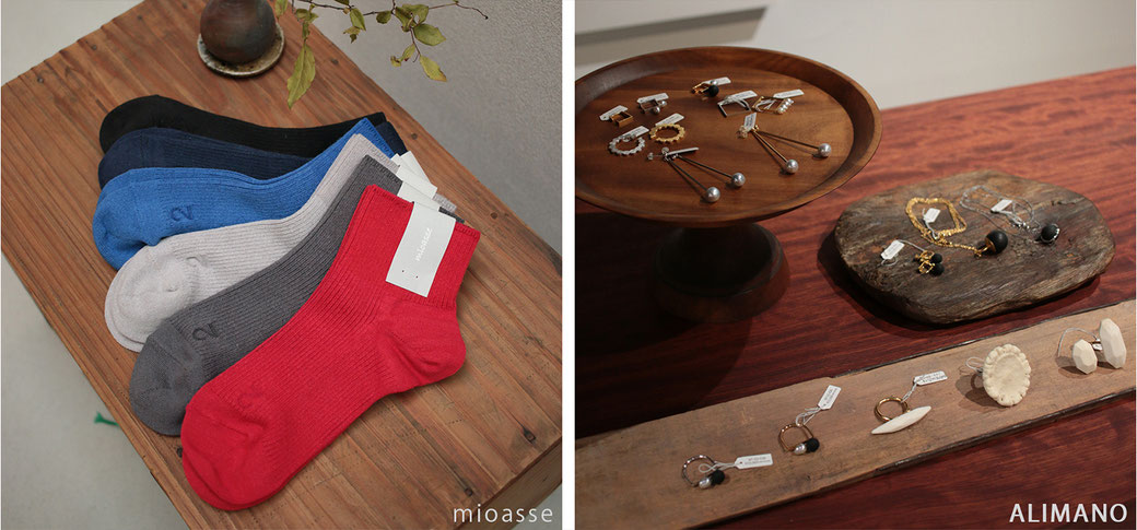 店内ではBIBLIOTECAの商品だけでなく、mioasseの靴下やALIMANOのアクセサリーなどセレクトのアイテムもご覧いただけます。